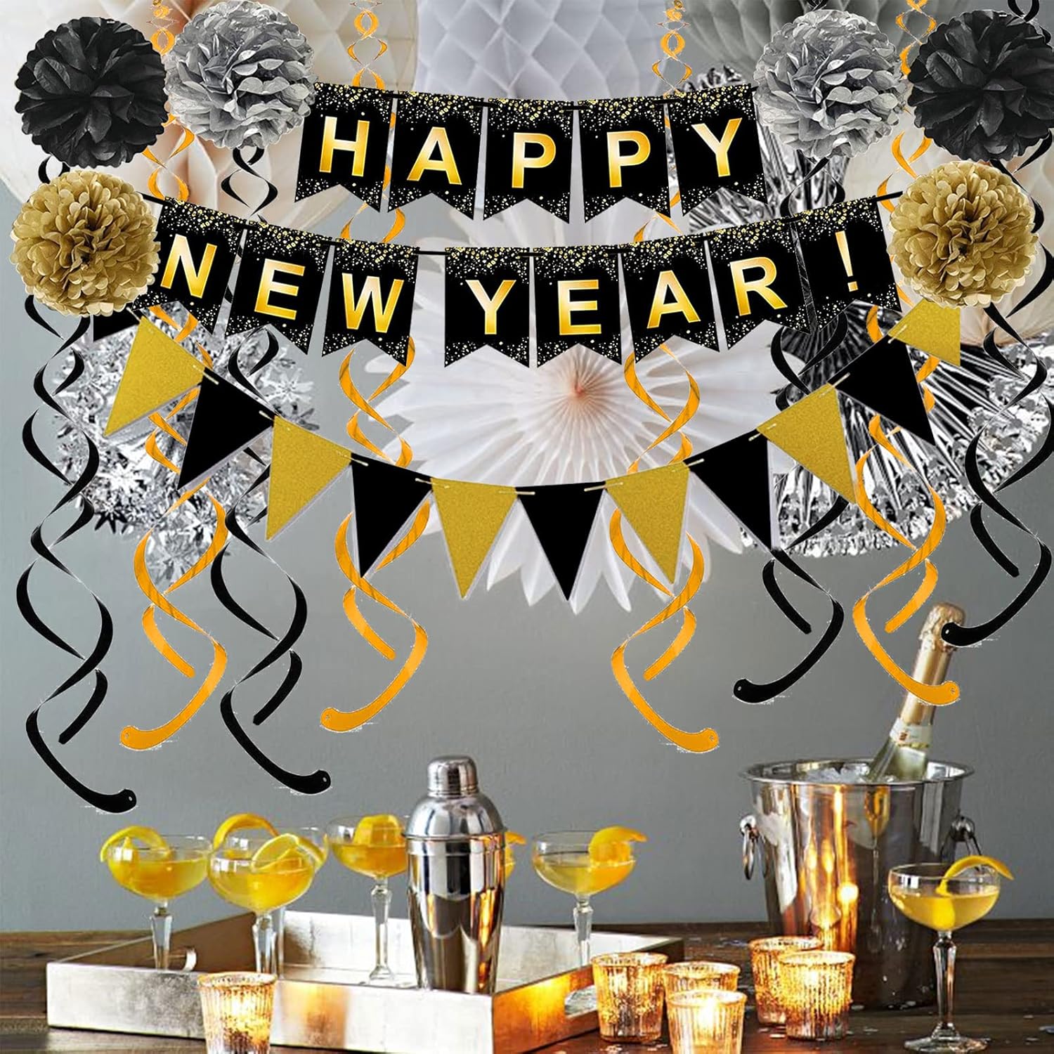 Happy New Year Set Black Banner with Gold Black Paper Flag Bunting Swirl Streamers & Pom Poms